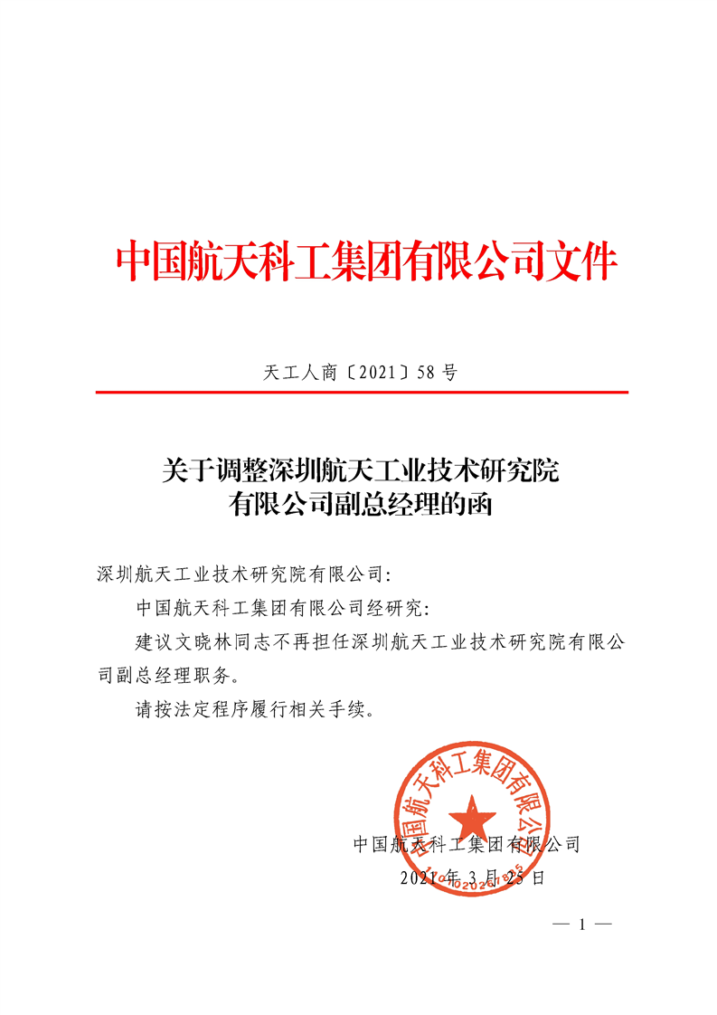 关于调整深圳航天工业技术研究院有限公司副总经理的函