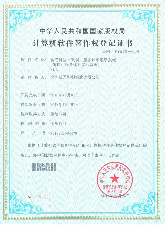 根据《计算机软件保护条例》和《计算机软件著作权登记办法》的规定:小微企业服务站以原始方式取得此著作的全部权利,深圳航天科创实业有限公司对此软件著作权登记证书享有全部范围权利。