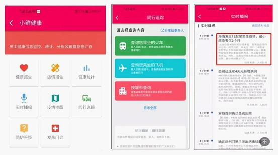 “小鲜健康”疫情防控APP部分功能界面