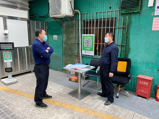 ▲余斌检查新阳大厦的防疫检测点