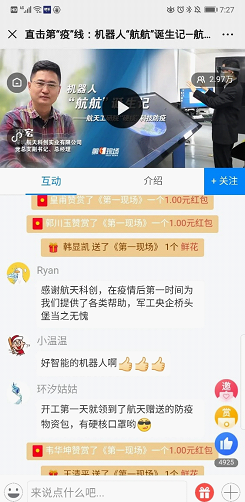 在直播中,航天科创公司总经理、青年突击队队长李宏介绍到,疫情爆发以来,航天科创成立了三支战“疫”青年突击队,包括机器人“战疫”青年突击队、信息化“战疫”青年突击队和科创云服务“战疫”青年突击队,以一碗泡面1000行代码的拼劲,以航天人“错误归零”的态度反复调试,机器人战疫突击队在一周时间内研发出了防疫辅助机器人“航航”。
