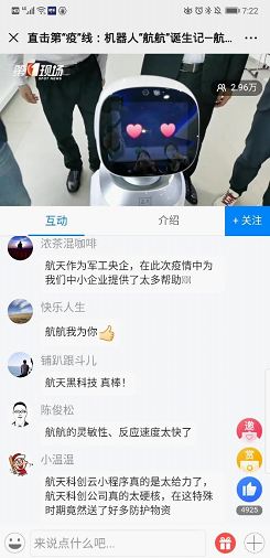 直播现场的主角“航航”是航天工研院所属航天科创公司协同生态企业研发的智慧型防疫机器人,这款机器人可在医院、政务大厅、社区防控等场景为市民提供7x24小时疫情防控信息查询、疫情防治政策宣传等服务,可在医院导诊、查房,在无接触的情况下查看病人电子病历、影像资料,调取检查报告并安抚病患情绪。更让人惊喜的是,“航航”可通过与病人聊天,对情绪悲观的病人进行及时的心理疏导,增强他们战胜疫病的信心。