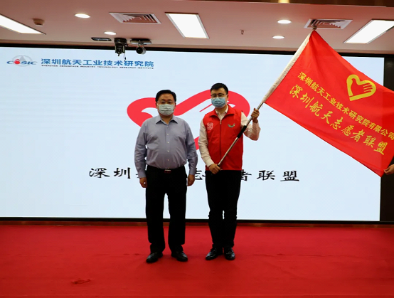 詹毅超对“深圳航天志愿者联盟”进行授旗,启动了航天工研院新一轮志愿服务活动。
