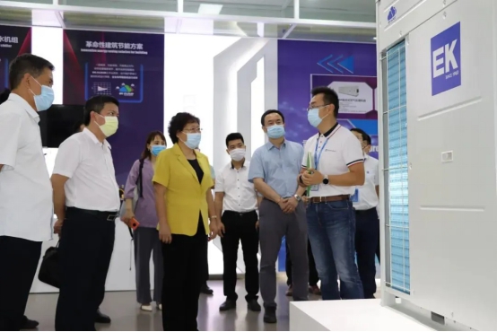 王健向喻丽君重点介绍了欧科公司自主研发磁悬浮离心机组、EKRV-E全变频•智慧云•多联机、-30℃超低温制热空气源热泵等重要产品特点和性能。