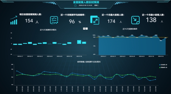 员工用餐的同时,系统将自动完成当日实际就餐人数统计,与预测就餐人数进行比对,进行模型验证,以提高预测准确率。目前,“食堂就餐预测模型”的预测平均准确率已达95%以上,助力员工食堂从供给侧入手减少浪费,塑造了厉行节约的正向循环。