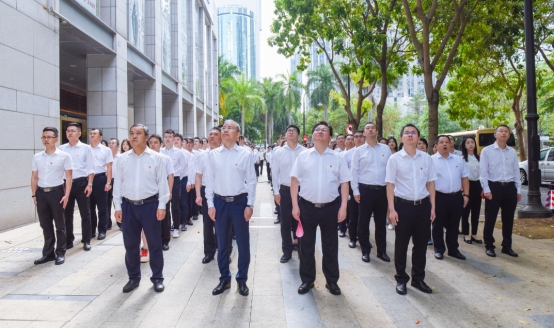 上午九时整,在雄伟壮阔的国歌声中,鲜艳的五星红旗冉冉升起,全体人员怀着崇敬与激动的心情面向国旗行注目礼。紧接着,伴随着嘹亮激昂的航天科工之歌,航天科工司旗缓缓升起,在场干部职工精神饱满、庄严肃立、整齐队列,迎接这神圣而庄重的时刻。