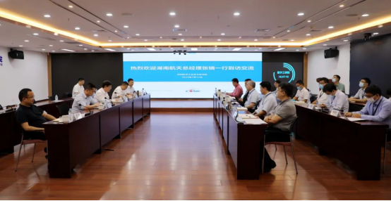 5月12日,湖南航天总经理张镝、副总经理郑自儒一行率队到访航天工研院开展合作交流,航天工研院党委书记、董事长刘浩,副总经理王洁刚及相关人员参加座谈。