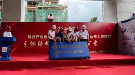 7月6日,航天工研院协同创新中心项目举办“工程主体结构突破百米”仪式,航天工研院党委副书记、副总经理刘瑞华,中航天建设集团党委委员、总工程师赵记军等参加仪式。