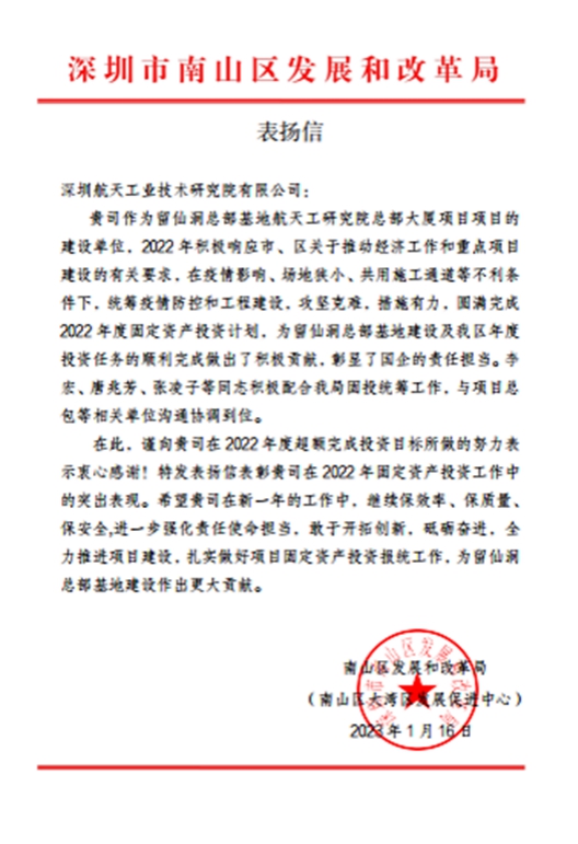 表扬信中指出,航天工研院作为留仙洞总部基地协同创新中心项目的建设单位,积极响应市、区关于推动经济工作和重点项目建设号召,在疫情防控最吃劲、最关键的阶段,在场地狭小、共用施工通道等不利条件下,统筹疫情防控和工程建设,逆行出征、尽锐出战、攻坚克难、措施有力,分秒必争在2022年度超额完成投资目标,为留仙洞总部基地建设及南山区年度投资任务的顺利完成做出了积极贡献。
