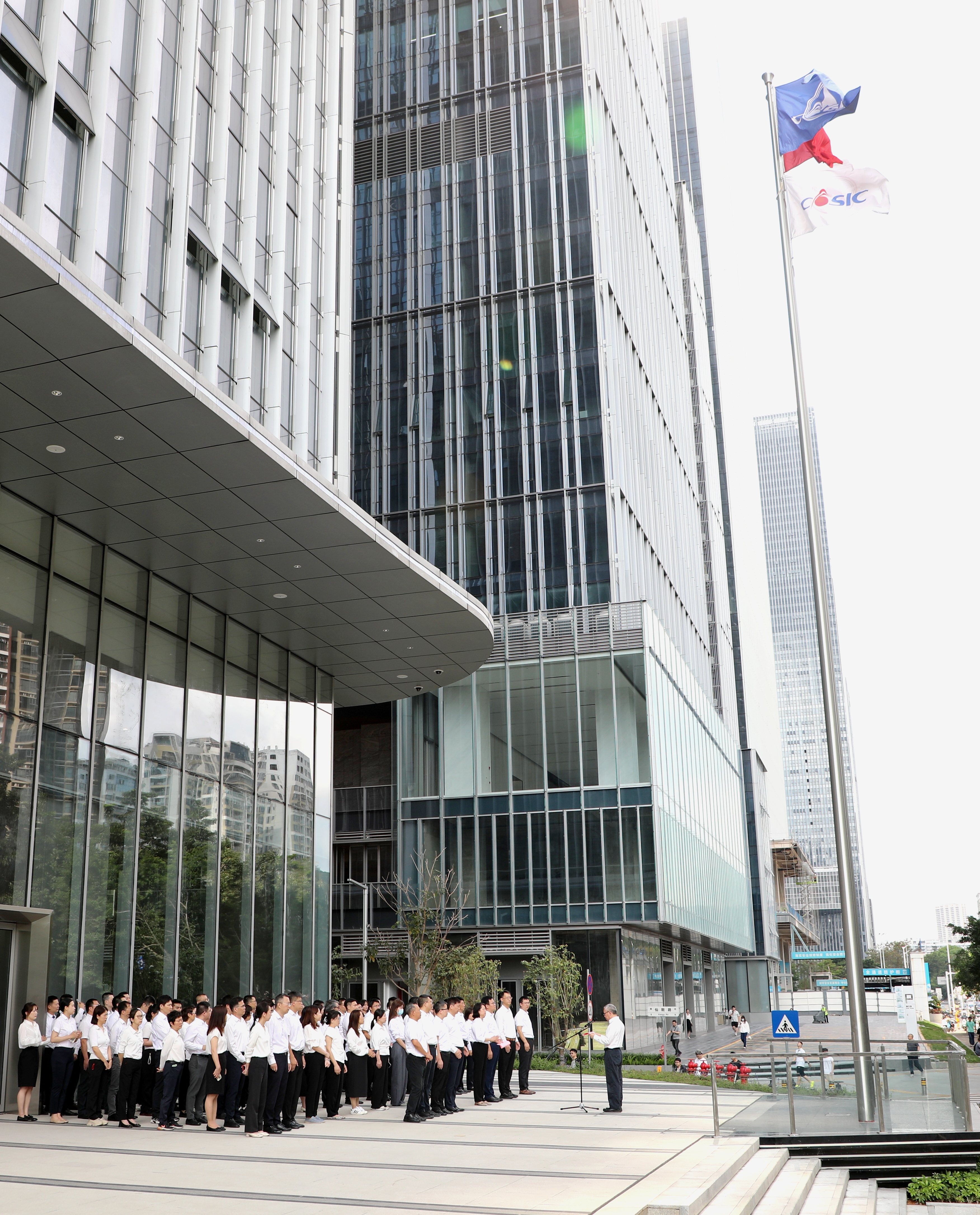 航天工研院党委书记、董事长金立亮发表讲话,在深领导班子成员、本部全体职工、在深单位干部职工代表参加升旗仪式。