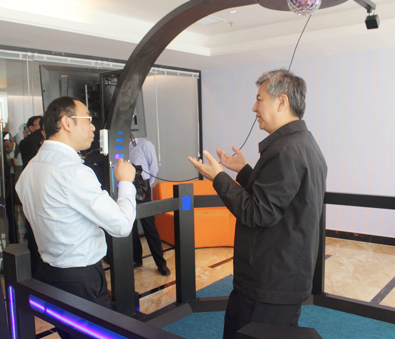 徐占斌副局长在中心主任卢华辉的陪同下,详细了解了工研院的成立、运营与规划情况。在江西科创中心VR体验馆中,徐占斌副局长亲身体验了VR场景,对VR产生了浓厚的兴趣,他感叹到“效果很好,很逼真,完全是身临其境。”徐副局长还与VR入驻团队进行了热烈和深入的探讨,抛出“这个VR的核心技术是你们自主研发的吗?”、“在VR体验感上是否存在提升的空间?”、“在VR内容研发上是否存在一起困难?”等一系列问题,VR入驻团队负责人向徐占斌副局长进行了详细的解答。