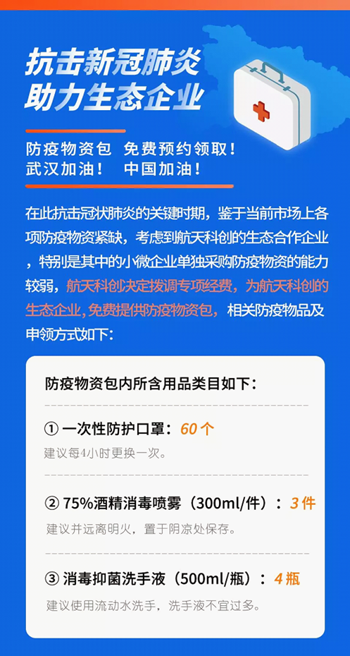 因当前防疫物资紧缺,该免费申领政策仅限航天科创云企业注册用户, 且仅支持上门领取。请各企业登录科创云进行报名,物资数额有限,先报先得,领完即止。相关具体申领方式如下:
