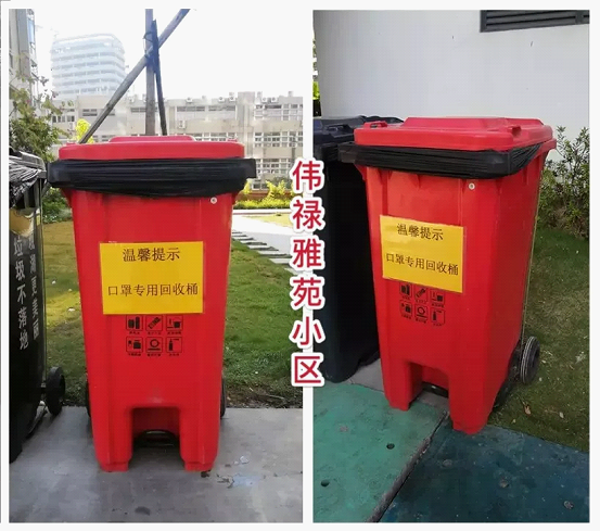 为防止废弃口罩造成二次污染,并方便居民丢弃废弃口罩,物业管理人员在小区专设的口罩专用回收桶,丢弃的口罩进行集中回收处理。
