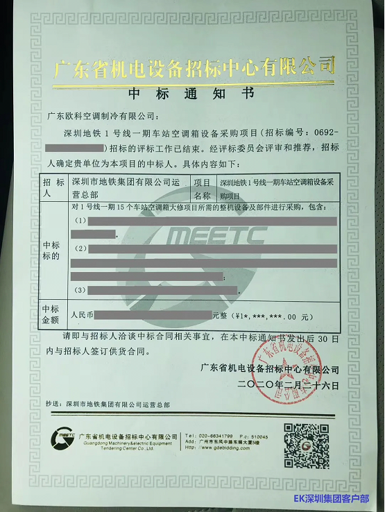 近日,欧科公司成功中标深圳地铁1号线一期车站空调箱设备采购项目,中标金额超千万元。据了解,欧科公司凭借卓越的产品品质、周密的设计方案以及完善的专业服务,积极融入地方规划,相继服务成都、青岛、长春、杭州等多个城市地铁项目,更拿下了北京大兴国际机场和深圳机场T3航站楼等相关服务项目。