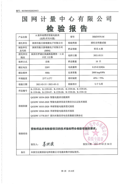 近日,航天泰瑞捷基于“国网芯”核心MCU研发的2020正式版(2021版)A级单相费控智能电能表,顺利通过正式版样机的首批检测,获得检测合格报告。