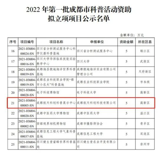 近日,航天科创所属成都科创获批2022年第一批成都市科普活动资助立项项目,成都科创段岚同志荣获“2021年度成都市科普工作先进个人”称号。后续,成都科创将继续发挥科普基地的作用,从科普基地建设、科普活动设施、科普活动内容、科普活动影响效果等多个维度丰富科普活动,不断完善科普管理架构,利用自身优势开展形式多样的科普活动,宣传航天知识,弘扬航天精神,传播航天文化。