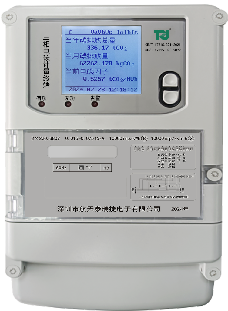近日,航天泰瑞捷成功研制首款电碳计量终端(“电碳表”)。该款电碳表是在航天泰瑞捷自研的碳计量模型算法基础上研发,不仅具有传统的电能计量功能,还能配合系统端动态计算更新电碳因子的准确数值,实时显示累计碳排放量数据,为用户提供准确的碳排放量。该款电碳表根据用户的用电情况,实时调整不同的电碳因子,实时计算并给出企业用电带来的碳排放量,体现电力生产源头的时间和地域差异。用户可实时掌握自身碳排放情况,为制定更加绿色低碳的生产模式提供依据。