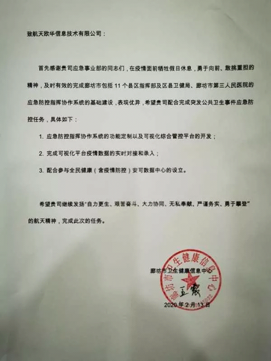 2月13日晚上,河北省廊坊市卫生健康信息中心向航天工研院所属欧华公司来函表示感谢,并下达下一阶段的工作任务书。为此,吴京明在公司的支持下,迅速组建专业队伍,涵盖一线业务人员和产品、售前、研发、数据、测试等多条业务线人员,全力保障相关工作。