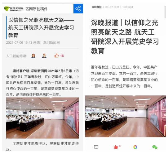 党史学习教育开展以来,航天工研院以走在前列、勇当尖兵的政治自觉,高标准高质量开展党史学习教育。一节节精彩生动的党课培训,一桩桩解民忧、纾民困的暖心实事,一项项学党史、知党情的创新项目,让党史学习教育在企业内部热起来,也让广大党员干部职工以史为鉴、以史崇德,弘扬航天精神,传承老一辈航天人的优良传统,坚持“两个一以贯之”,在新起点上将改革发展事业不断推向前进。获《深圳晚报》等媒体关注,报道全文如下: