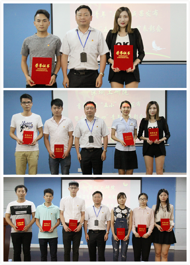 “我们是五月的花海,用青春拥抱未来……”,表彰会在歌声中拉开序幕。会上,团委副书记孙浩就2016年团委工作做简单回顾,布置了2017年工作要点,团委副书记刘明宣读了首届青年“五小”成果获奖名单以及深圳工研院2016年度先进集体和先进个人名单。深圳工研院领导为首届青年“五小”获奖青年代表和获得2016年度“五四红旗团支部”、“优秀团干部”、“优秀共青团员”的集体和个人颁发了荣誉证书。